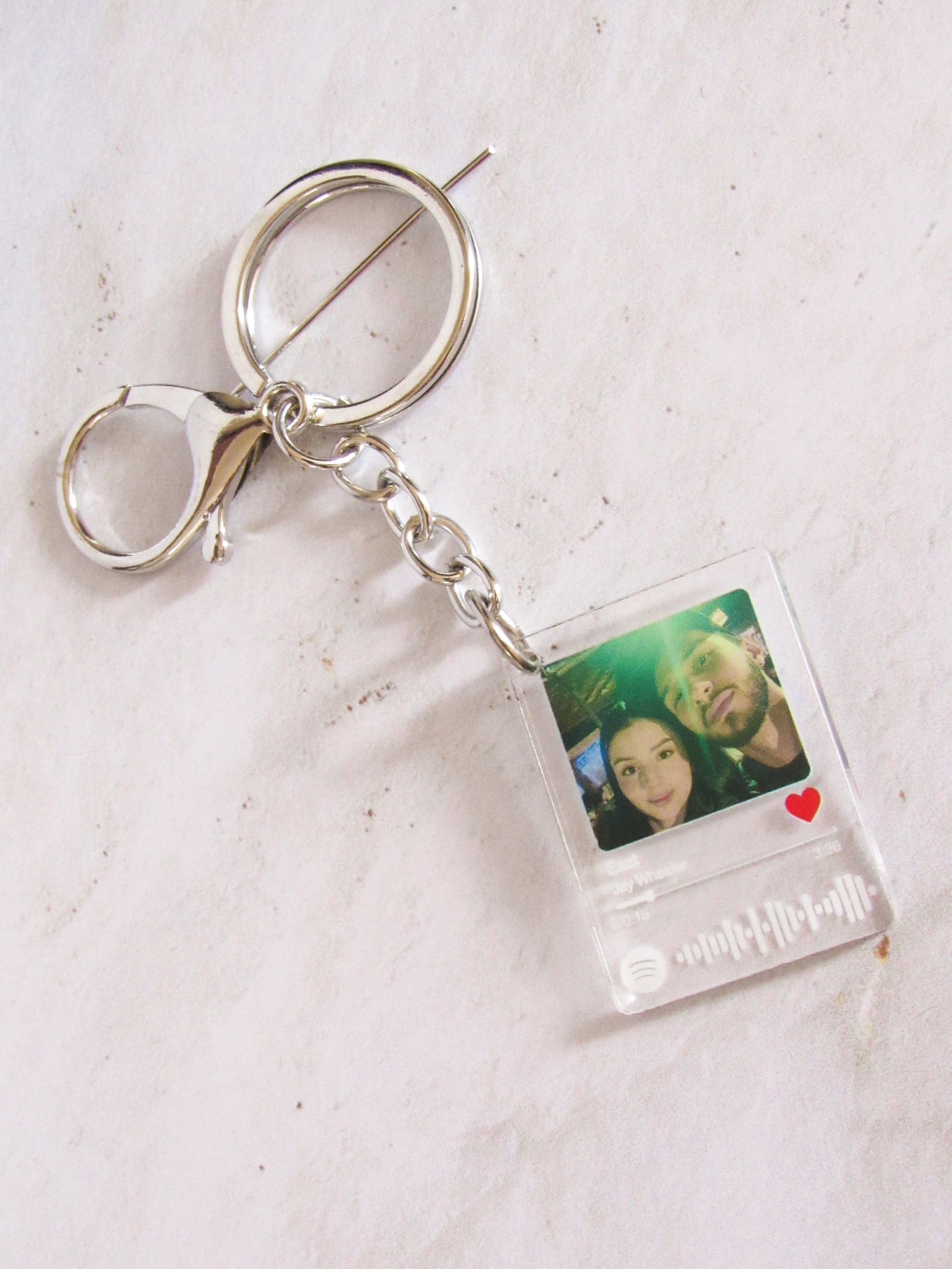 El valor incluye una foto marcado, código Spotify y herraje llavero